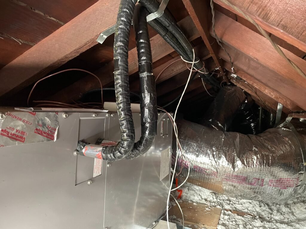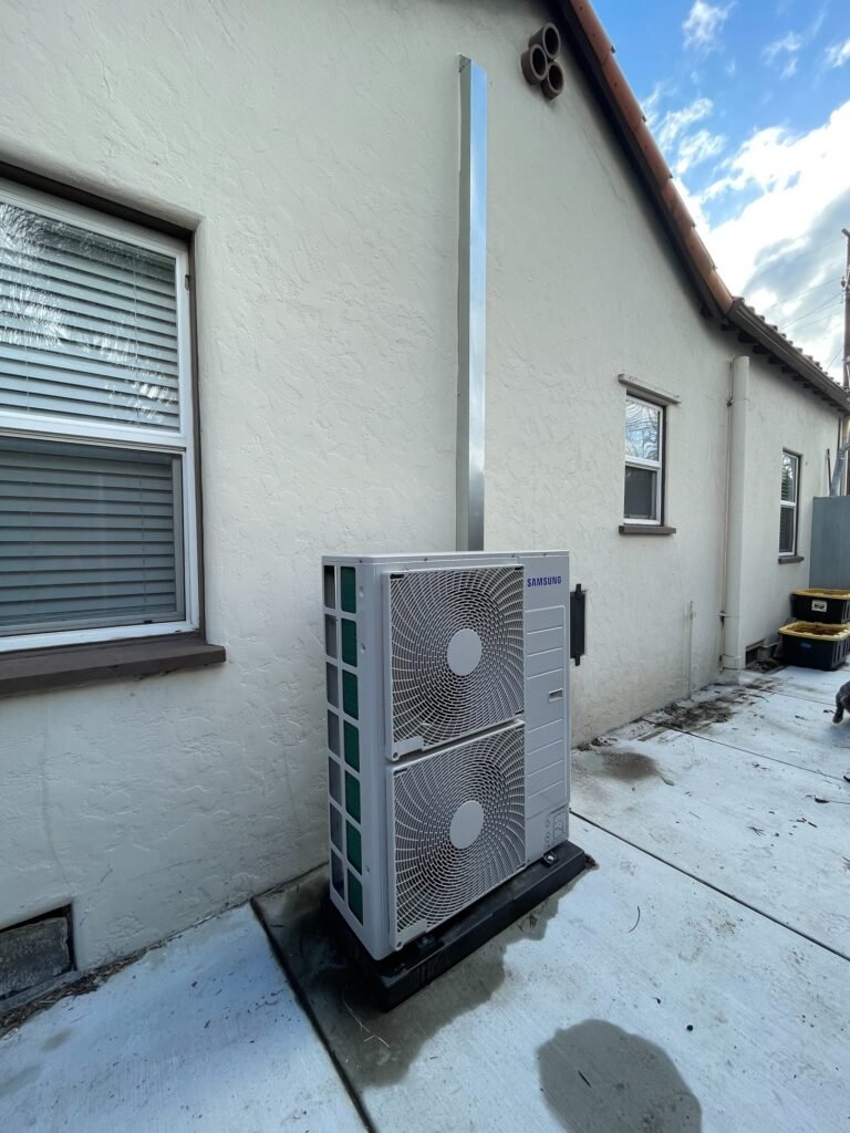 This home in Upland, CA was built in the 1900’s. There was never any air conditioning in the home, there was a wall heater to heat the home in winter time. After assessing the home it was determined that there was enough space in the attic to install a central air system. The only issue was access, we cut out the stucco siding and framed in a vented access panel. With easier and larger access we were able to place a fan coil in the attic and then duct the space out. We installed ceiling supply vents in all the rooms with a central return.