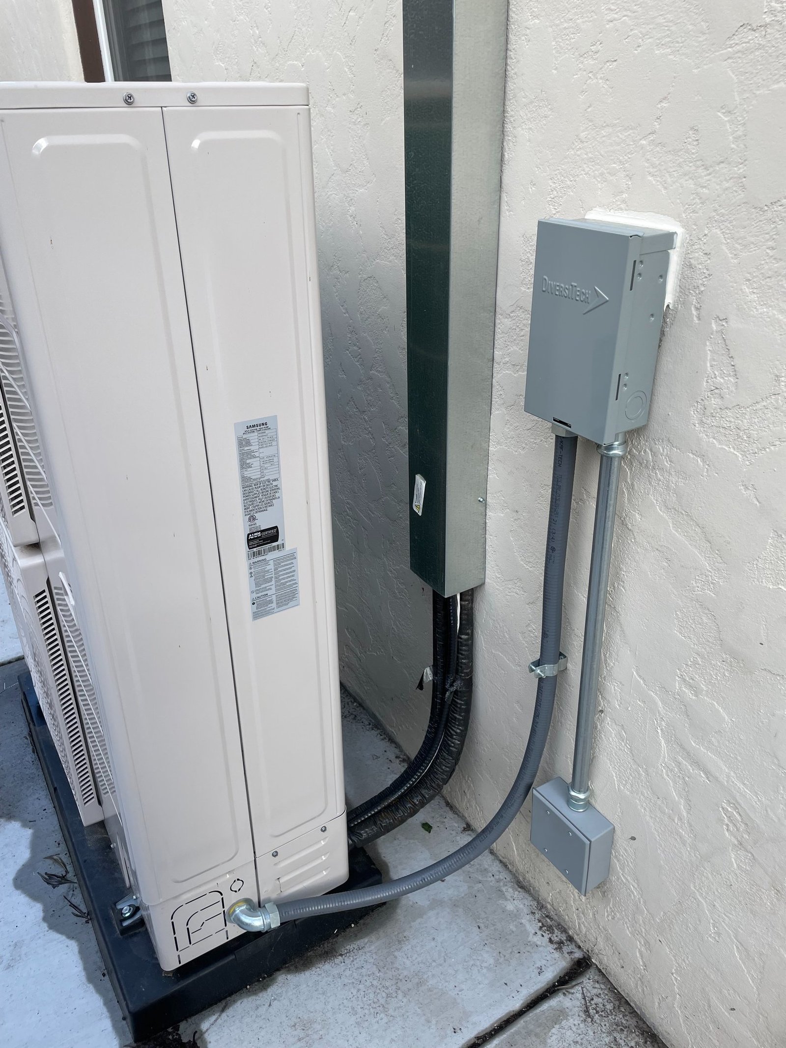 The Samsung system that was installed only needs 230V singe phase power to the outdoor condenser unit. The condenser has the ability to send power to the indoor fan coil, eliminating costs of the electrician installing power supply into the attic. The system is a heat pump and can sufficiently cool or heat the space any time of the year with efficient costs due to its advanced inverter technology.